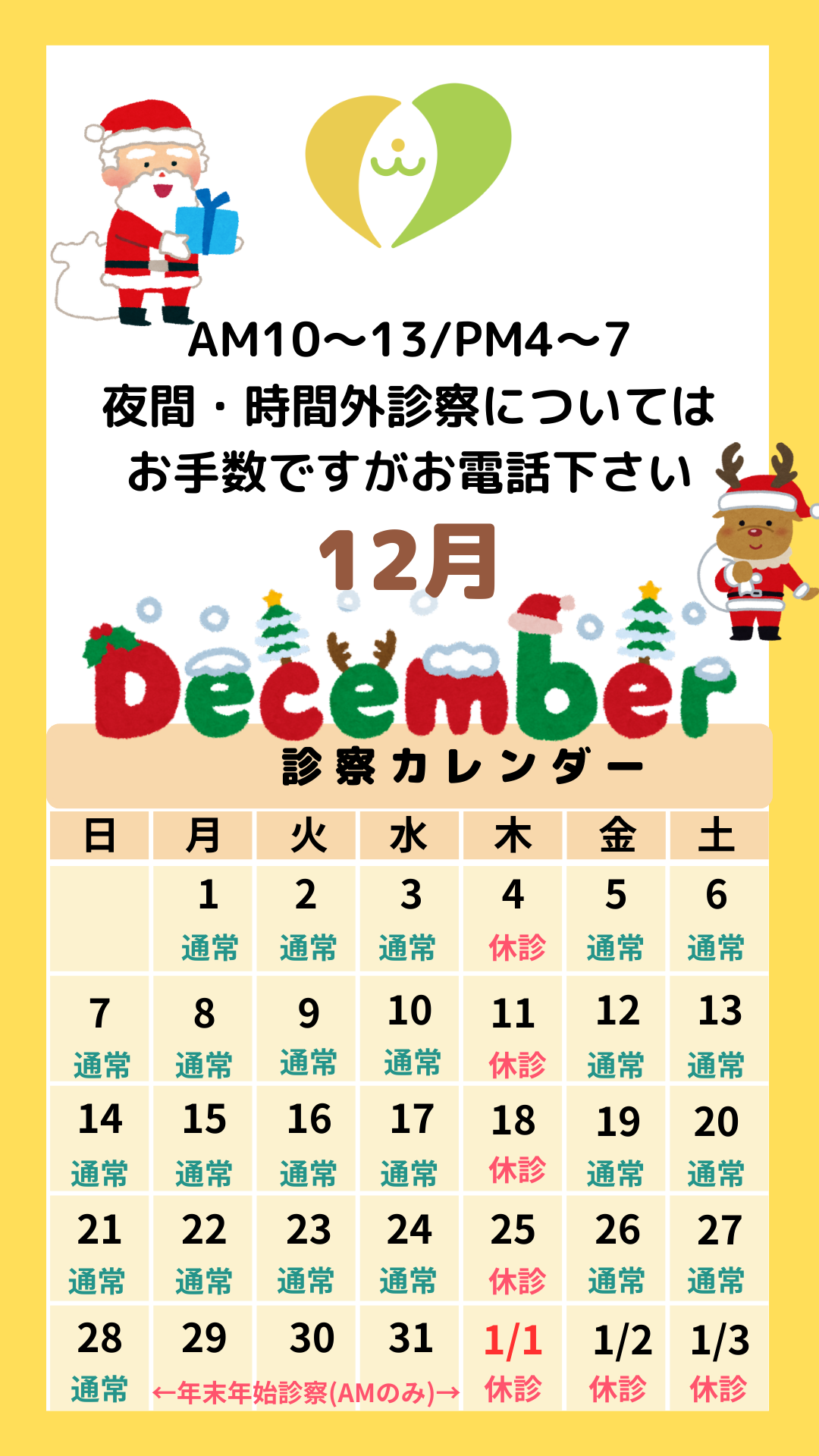12月の診察カレンダー・予約ページ、年末年始の診察について