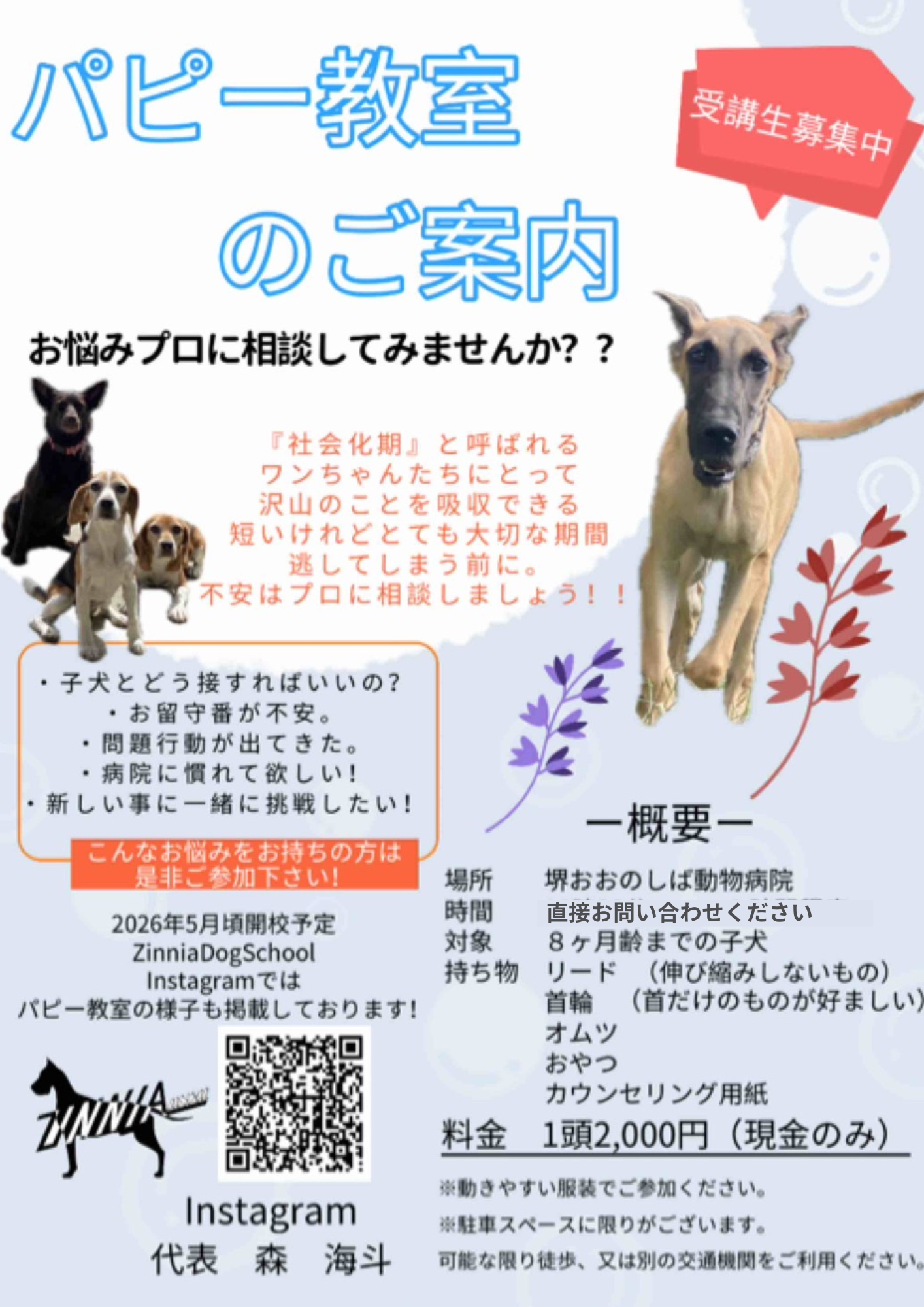パピー教室に関するお問い合わせは、直接当院までお電話(072-360-4061)にてお待ちしております(^^)